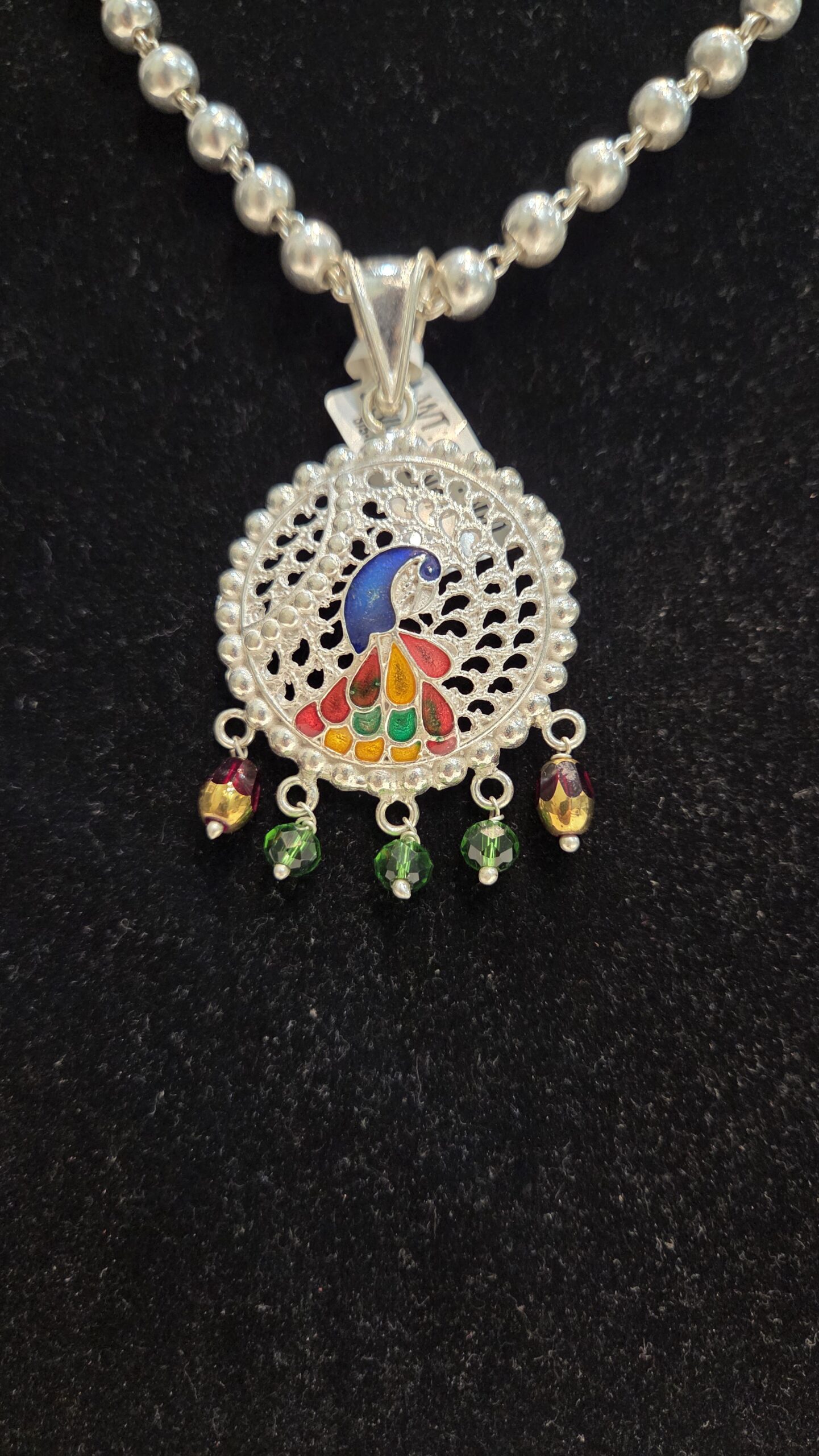 SILVER PENDENT SET WITH SILVER MALA LENGTH IS ADJUSTABLE AS YOU LIKE.